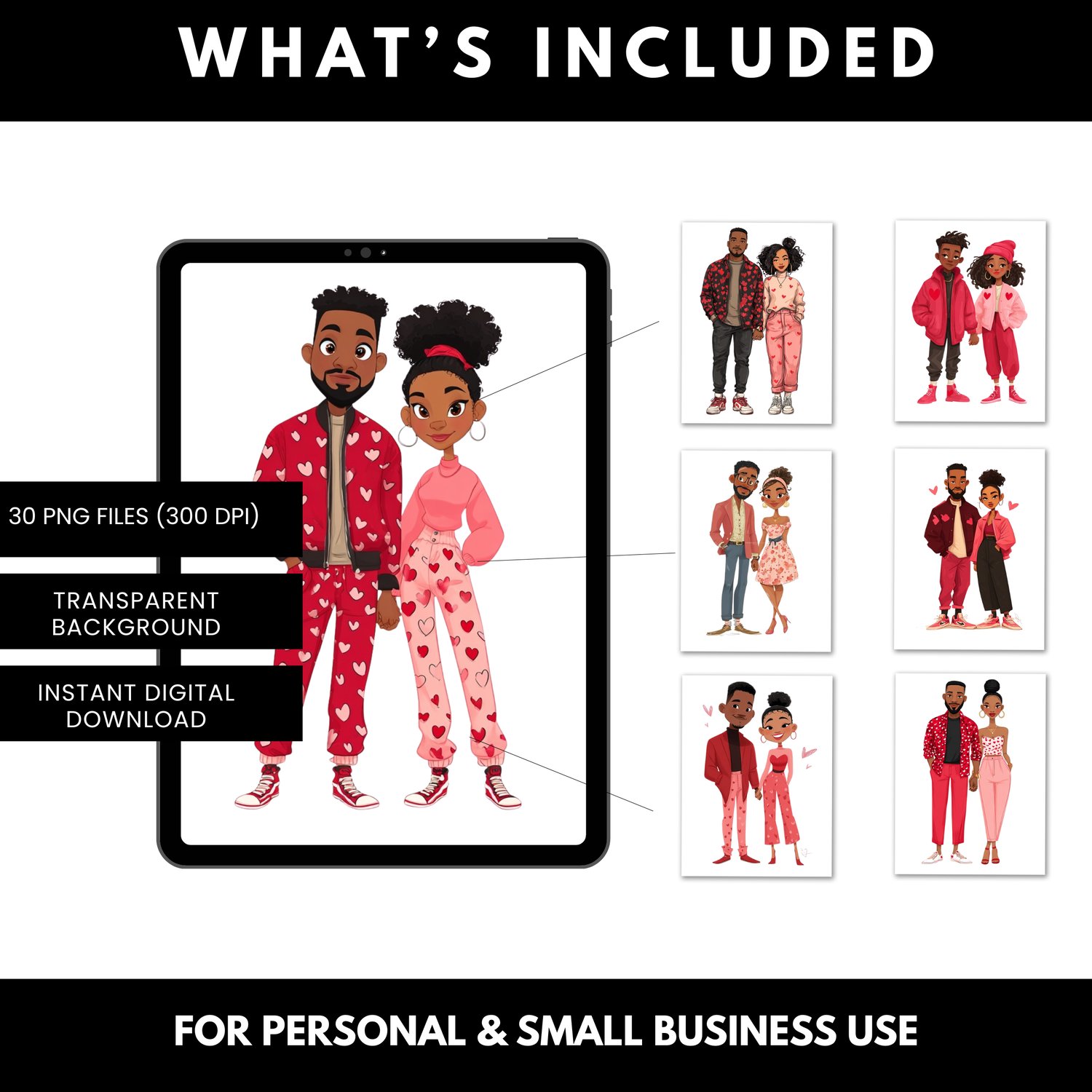 Sweetheart Love blends romance, fashion, and Black representation into one cohesive bundle. The soft color palette and modern outfits make it easy to mix, match, and reuse across multiple projects—giving creators maximum flexibility and value.