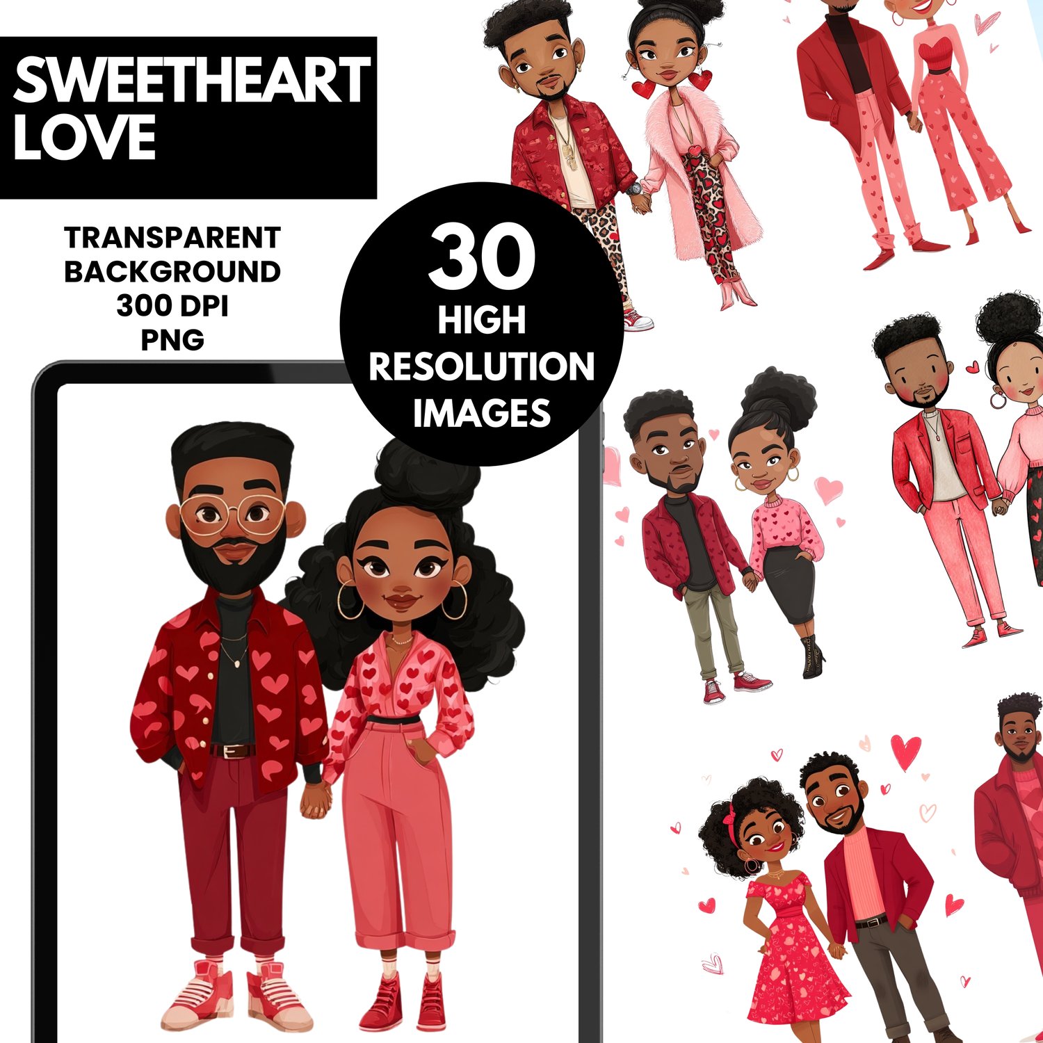 Sweetheart Love is a modern Valentine-inspired clipart bundle celebrating Black love in all its warmth, style, and sweetness. This collection features beautifully illustrated African American couples dressed in coordinated red, pink, and blush outfits—perfect for romantic, fashion-forward designs.