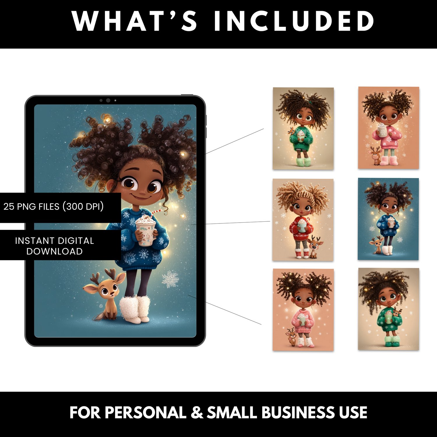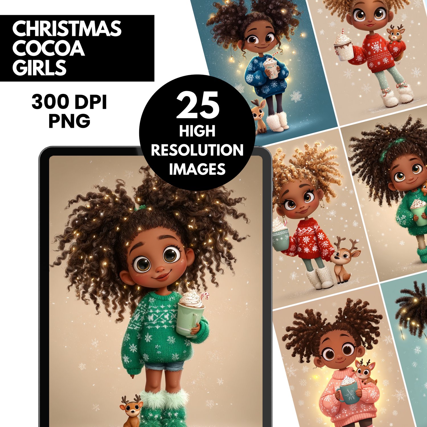Bring pure holiday magic to your creative projects with the Christmas Cocoa Girls Image Bundle—a beautifully illustrated collection featuring adorable African American girls with curly hair, cozy winter sweaters, sparkling accents, and warm cups of cocoa. Each illustration is crafted with soft lighting, charming expressions, and a gentle holiday glow that instantly elevates any design.