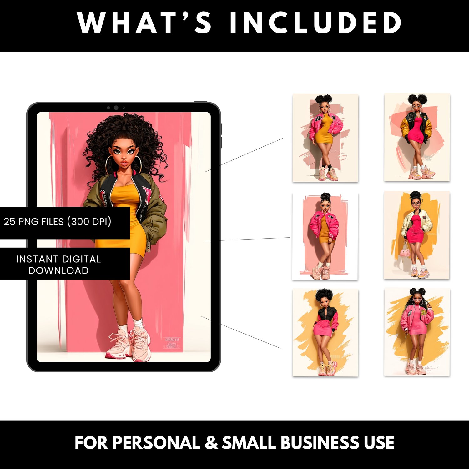 The Color Pop Edit V1 | Black Girl Fashion Illustrations, Afrocentric Clipart Bundle, Bold Pink & Mustard Streetwear Art, 25 PNG Images