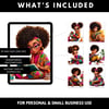 Bring warmth, style, and personality to your creative projects with this Black Girl Bookworm Clipart Bundle — a collection of 25 beautiful PNG illustrations featuring an adorable African American girl with afro puffs, cozy outfits, and vibrant colors. Perfect for book lovers, journal makers, sticker designers, and digital planners, this set celebrates the joy of reading and self-expression.