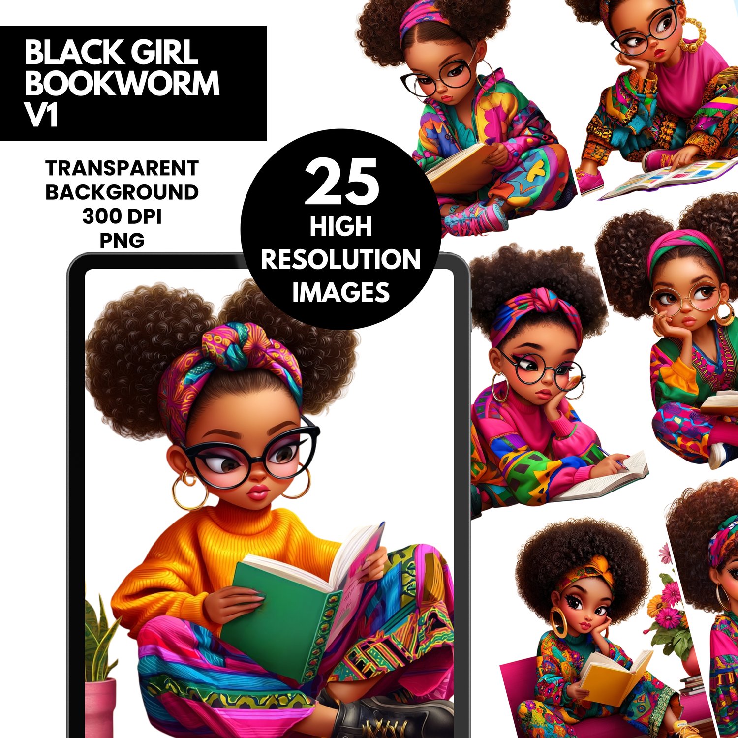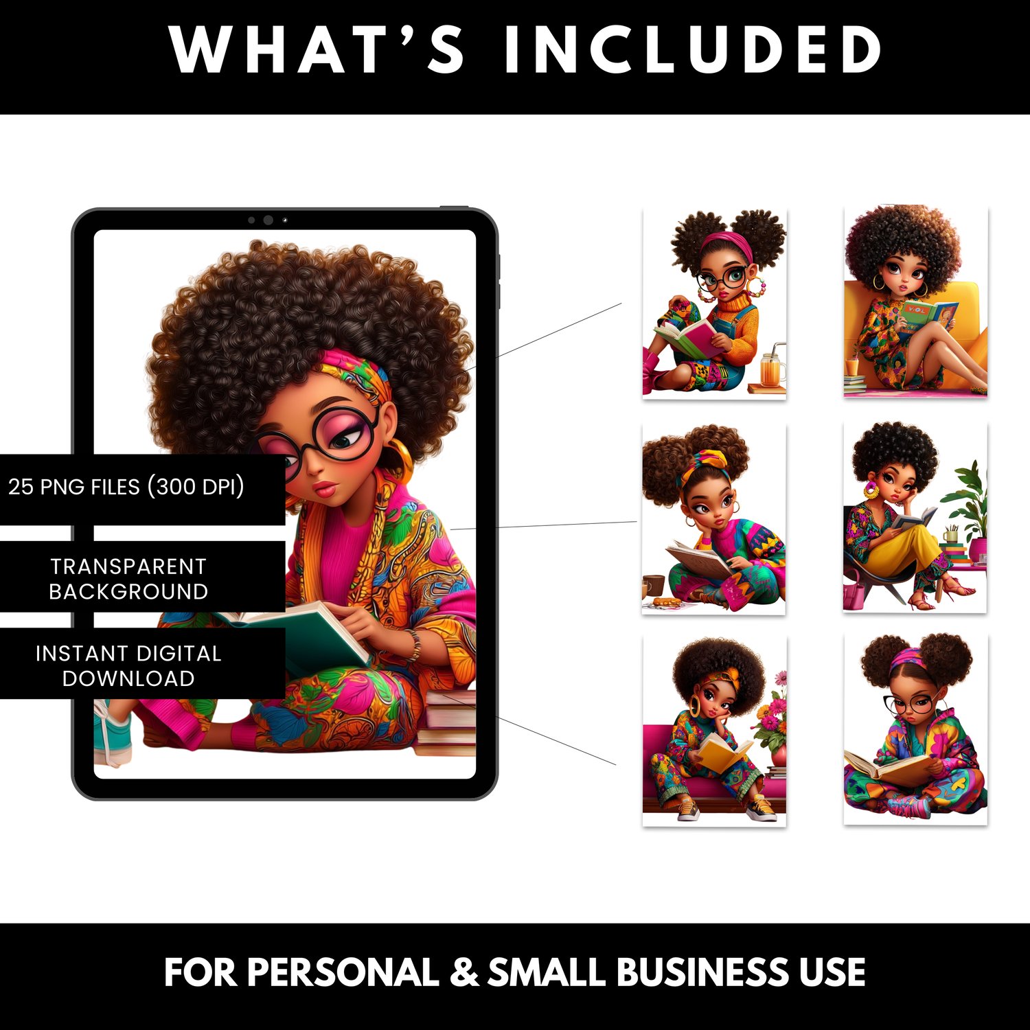 Black Girl Bookworm Clipart Bundle | 25 Cozy Reading Illustrations | Afro Puff Girl Clipart | Digital Download | PNG Files for Stickers, Journals & Wall Art