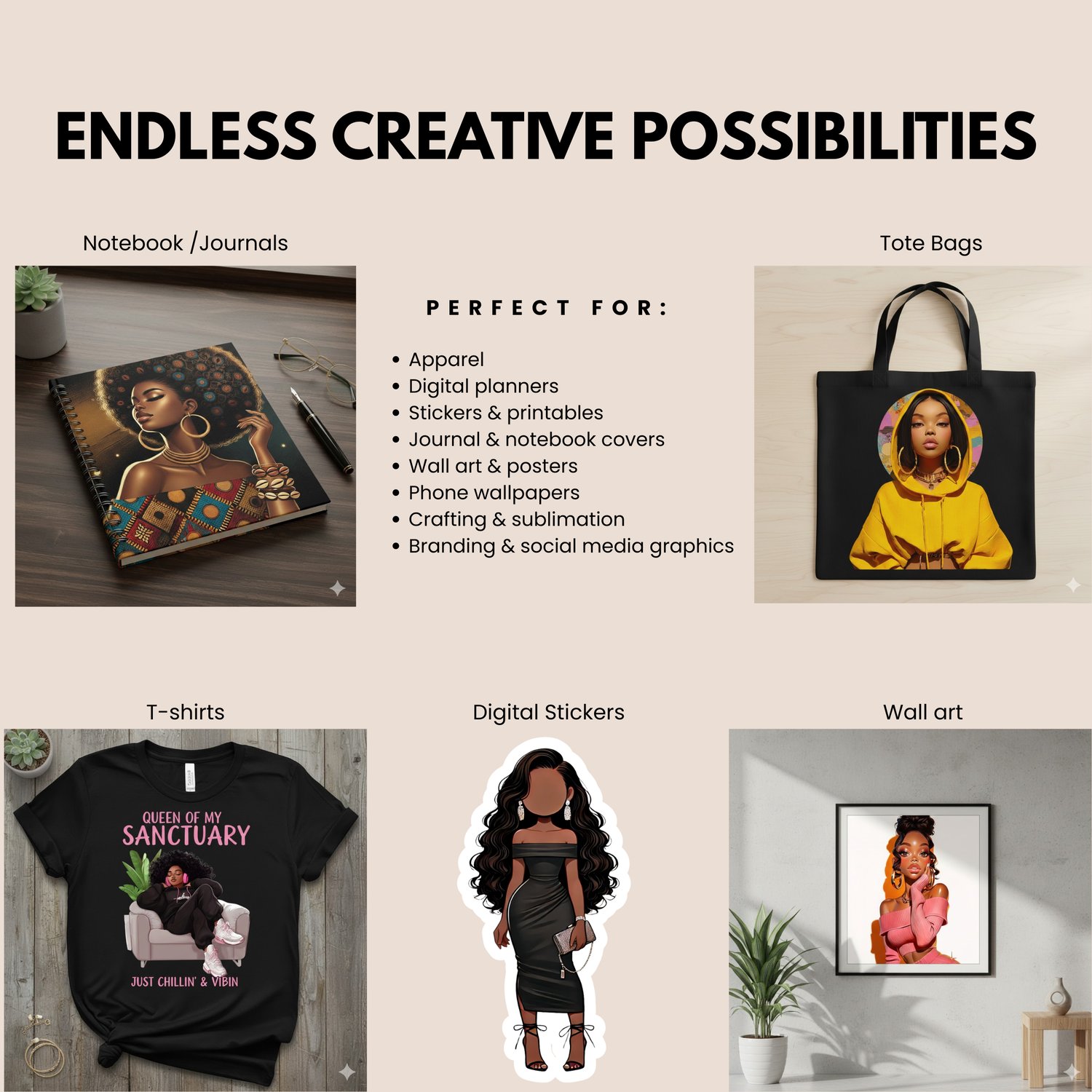 Your new go-to library for high-resolution PNG images featuring bold, stylish, beautifully illustrated Black characters. Whether you are creating planners, stickers, apparel, journals, or branding materials, this collection gives you everything you need to design products your customers will love without spending hours searching for art.
